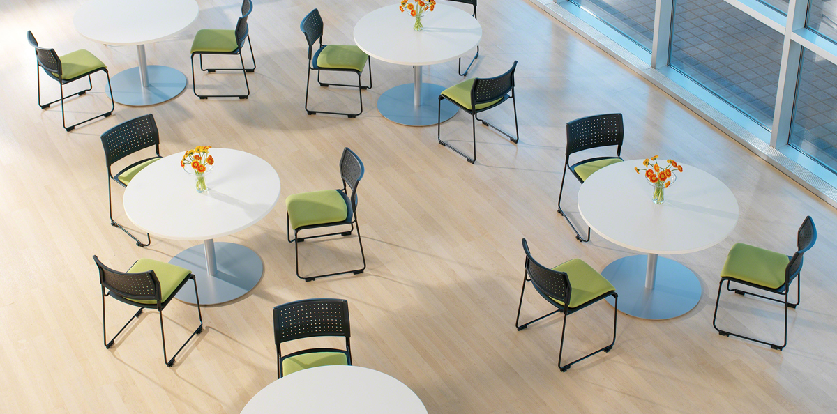简约时尚的钢脚长桌围成一个方形,需要根据房型及面积来选择。